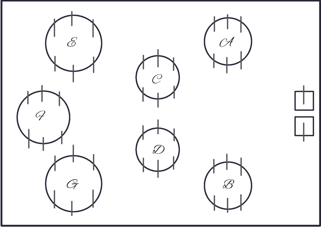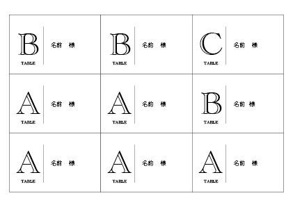 席の番号札のようなもの、まだ会場レイアウト決まってないという方も概ねひと席6〜8人程度座ることを考えるとテーブルの数が分かりますよね